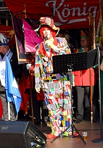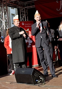 Eskortiert von der Prinzengarde stellten sich die zukünftigen Tollitäten ihrem Narrenvolk vor. Kinderprinz Dustin kokettierte damit, er sei mit 12 Jahren "in der Blüte seines Lebens" und bedauerte mit einem Augenzwinkern, als Prinz nun einmal vor Prinzessin Nina sprechen zu müssen. Stadtprinz Mark Schiffmann wird sein Amt zwar offiziell erst in zwei Monaten antreten, marschierte aber schon einmal mit einer eigenen Prinzenstandarte auf, für die es in Duisburg kein Vorbild gibt. Und er überraschte, indem er schon beim Hoppeditz-Erwachen ein Lied schmetterte. Der Trend, dass der oberste Repräsentant des Karnevals in Duisburg immer mehr als Unterhaltungskünstler begriffen wird, scheint sich fortzusetzen.
