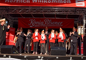 Der Auftakt zur Session 2016/17 gelang mit Bravour. Hoppeditz Brian Oehlschlägel kommentierte das Zeitgeschehen. Da bekam Satire-Reimer Jan Böhmermann ebenso sein Fett ab wie Donald Trump. "Ein Rüpel wie man ihn kennt, der ist nun in USA der Präsident." Vor den auf der Bühne versammelten Standarten der HDK-Gesellschaften ließen Präsident Michael Jansen und Oberbürgermeister Sören Link den Karneval hochleben: "Auf die schönste Stadt der Welt ein dreifaches Helau!"