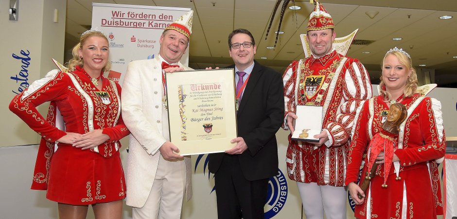44 Personen hat der Hauptausschuss Duisburger Karneval mit dem Ehrentitel „Bürger des Jahres“ ausgezeichnet. So lustig wie am Donnerstagabend in der VIP-Lounge der Schauinsland-Arena ging es bei der Zeremonie allerdings eher selten zu. Sting machte seinem Ruf als begnadeter Kabarettist alle Ehre.