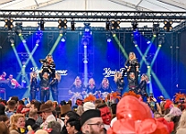 Lob gebührt auch der Kinderprinzencrew um Prinzessin Mia I. und Prinz Phil II., die ihre Bühnenshow mit etlichen Songs, Choreografien und Moderationen wie alte Hasen abliefern. Da müssen sich Holger II. und sein Gefolge entsprechend ins Zeug legen, um mitzuhalten, zum Glück hat auch die „große“ Tollität ein Ass im Puffärmel: Pagin Käthe, die so souverän moderiert, als hätte sie nie etwas anderes getan.
