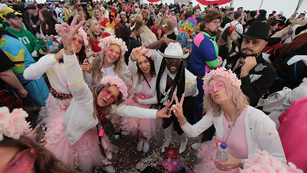 12 Uhr, das offizielle Programm tröpfelt so langsam aus. Ja, ein paar Karnevalsvereine dürfen sich noch präsentieren, aber die Kostümierten im mittlerweile rappelvollen Zelt wenden sich mehr und mehr ihren jeweiligen Getränken zu. Der Altweiber-Donnerstag, der Straßenkarneval, er hat gerade erst begonnen. Und der Alkohol unter 15 Volumenprozent, der schmeckt schon wieder.