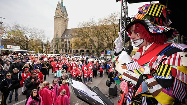 Der Auftakt der Session in Duisburg: Pünktlich um 11.38 Uhr nahm Hoppeditz Brian Oehlschlägel auf dem Burgplatz das Zeitgeschehen unter die Lupe.
