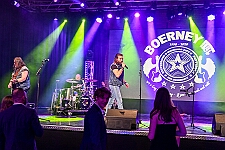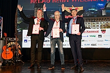 Der neue „Bürger des Jahres“ Frank Wittig (r.) nahm bei der Ehrung erst einmal einen kräftigen Schluck aus dem XXL-Glas mit Beecker Gerstensaft.