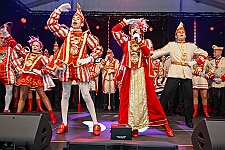 Auch wenn der Altweiberball in erster Linie natürlich eine Party ist: Ein offizielles Bühnenprogramm gibt es trotzdem. Das beginnt um 11 Uhr mit dem Einmarsch des HDK, inklusive Oberbürgermeister Sören Link und Stadtdirektor Martin Murrack. Der erste Bürger der Stadt wurde kurz zuvor im Rathaus von den Möhnen entmachtet. Für die Party im Zelt hat er sich in das grüne Gewand eines Jägers geschmissen. Auf der Bühne angekommen, fällt um beinahe jecke 11.10 Uhr Links Krawatte, und die Karnevalisten übernehmen endgültig.