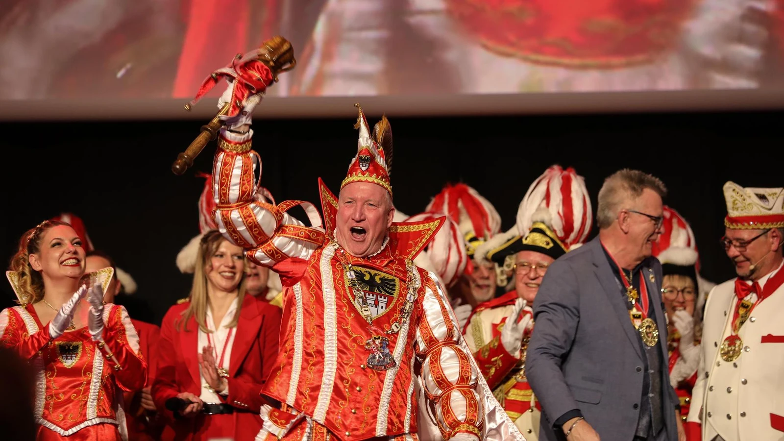 „Ein Traum ist in Erfüllung gegangen“, gestand der neue Feder- und Zepterträger dem Publikum. Und er dankte allen, die das ermöglichten. Vor allem aber dankte er jenen sechs Herzensmenschen, die mit ihm auf die 40-tägige Reise durch den Duisburger Karneval gehen. Als Hofmarschälle stehen ihm der selbstständige Coach und Verhaltenstrainer Thomas Hicking (56) von der KG Blau-Gelb Baerl und der AWO-Objektmanager Oliver Roßkothen (56) aus der Ehrengarde der Stadt Duisburg Blau-Weiß zur Seite.