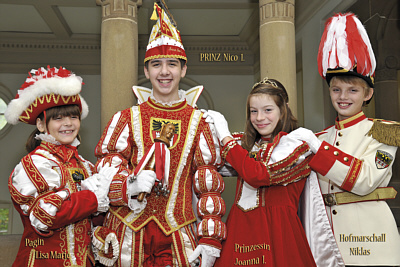 ![]() Prinz Nico I. (Schornstein), mit seiner Prinzessin Joanna I. (Martin), Page Lisa Marie (Galle)und Hofmarschall Niklas (Schaefer) |