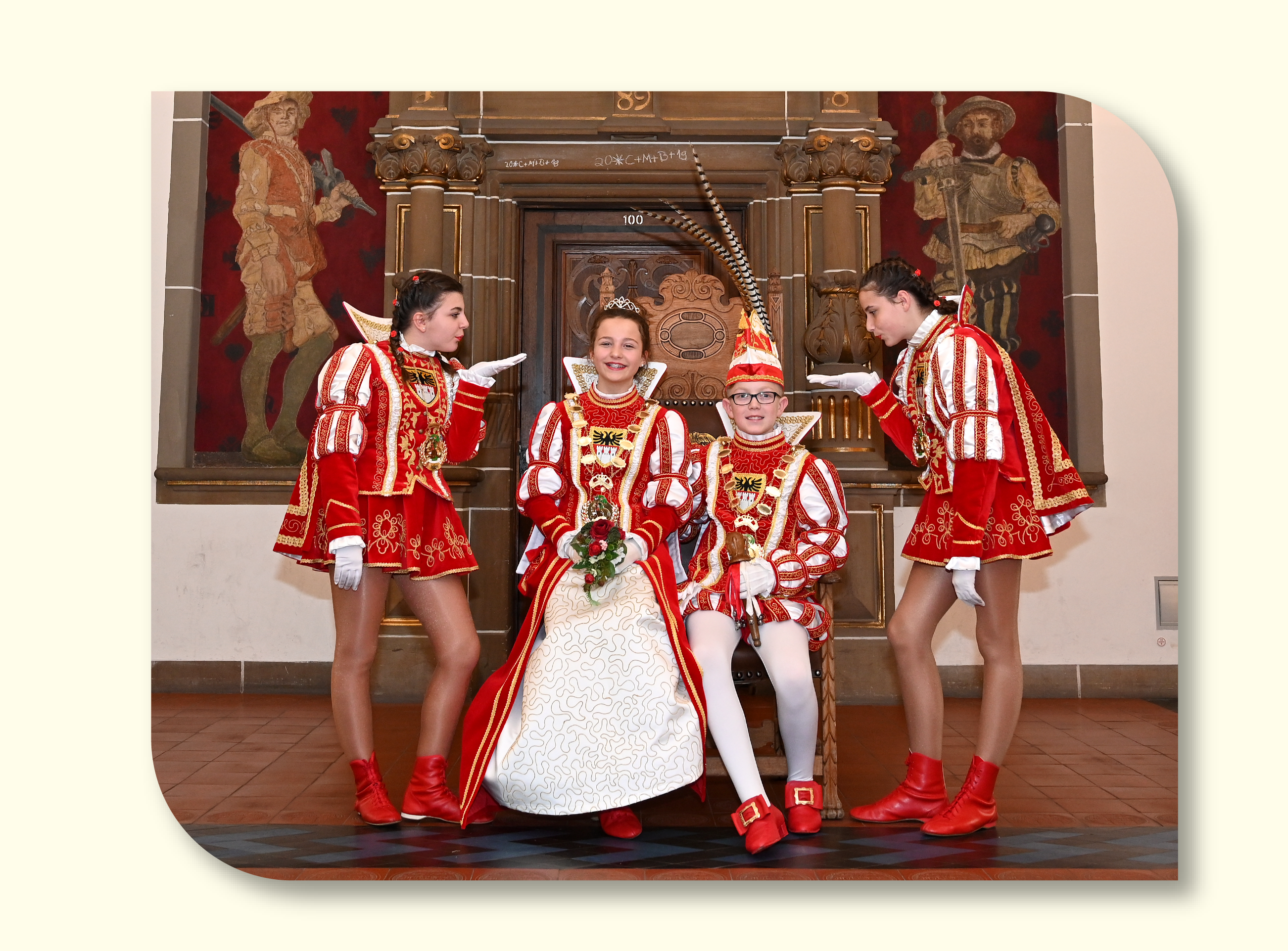 ![]() v.l.: Pagin Celina (Celina Döring), Prinzessin Maya I. (Maya Sapor), Prinz Luca II. (Luca Kaminski) und Pagin Jana (Jana Quattelbaum) |