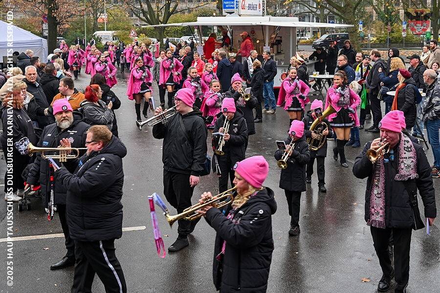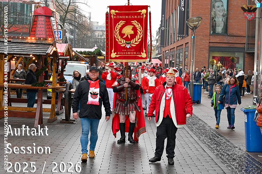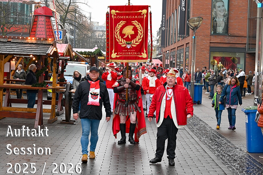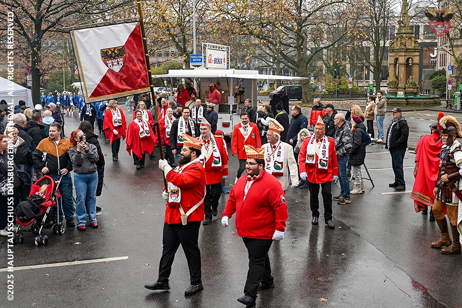 Bei typischem Novemberwetter startete der Umzug vor dem Forum. Die Gesellschaften zogen über die Königstraße, vorbei am Weihnachtsmarkt, zum Burgplatz vor dem Rathaus. Nachdem der Hoppeditz erwacht war folgte ein buntes musikalisch und tänzerisch gestaltetes Programm mit den angeschlossenen Gesellschaften.