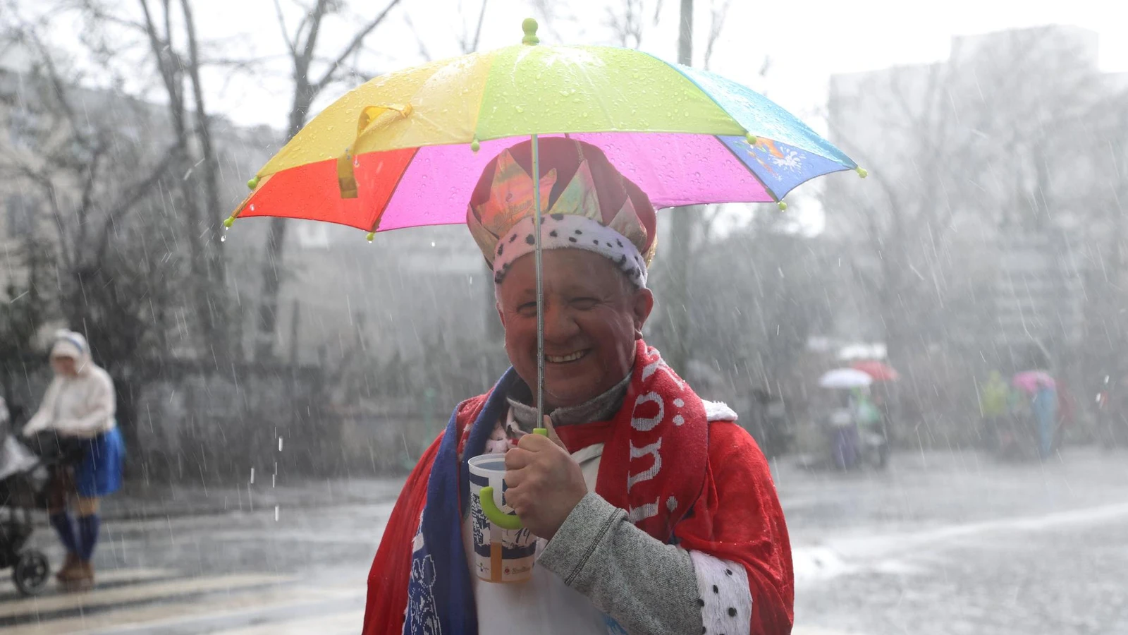 Der Laune der Jecken tut das abermals keinen Abbruch, oder zumindest merkt man es kaum. In dem kleinen Straßenwirrwarr zwischen Kammer- und Koloniestraße, in dem sich der Zug ein wenig wie ein kölscher „Veedelszoch“ anfühlt, weht der Geist des Trotzes. Jetzt sind wir eh schon nass, so ungefähr der Gedanke, jetzt ist es auch egal, und die jecke Resilienz wogt durch die hohlen Straßenschluchten, jeder Schluck Bier und jedes Stück Kamelle ein Sieg über die Naturgewalten.